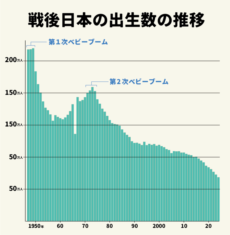 昔はとてもたくさんの赤ちゃんが生まれていました。1947年ごろの「第1次ベビーブーム」では、1年間に270万人ちかくの赤ちゃんが生まれました。その子たちが大人になるころには「第2次ベビーブーム」がきて、1年間に200万人をこえる赤ちゃんが生まれました。ところが、その次に「第3次ベビーブーム」がくると言われていたのに、もうやってきませんでした。1970年代の後半からは、赤ちゃんの数はずっと少なくなり続けています。